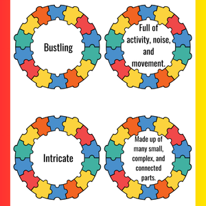- Vocabulary tasks: synonym matching, sentence writing, contextual application, image interpretation, and creative writing