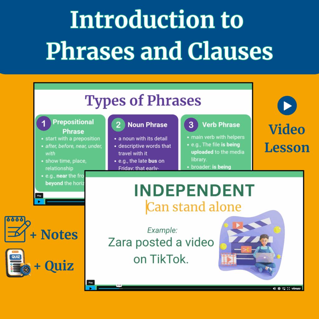 This teaching pack provides a clear, structured introduction to phrases and clauses for Grades 7–10. The video lesson explains the differences between phrases and clauses, independent vs. dependent clauses, and the role of conjunctions. Students are guided through each concept with examples that support understanding and classroom discussion.