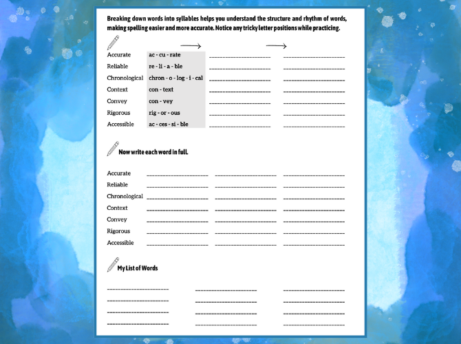 Multisyllabic accuracy shows up everywhere: literary analysis, lab reports, history essays, and applications. Correct spelling improves clarity, grades, and confidence. Syllable work is efficient because it targets the high-value skills behind accuracy: base word integrity, suffix patterns, and vowel team placement.